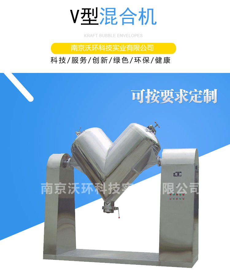 產(chǎn)品概述: 本機(jī)適用于制藥、化工、食品的干粉狀、顆粒裝物料的混合。該機(jī)混料筒結(jié)構(gòu)獨(dú)特,混合均勻,效率高,不積料。整機(jī)結(jié)構(gòu)簡(jiǎn)單,操作容易。外表面和物料接觸部分均采用優(yōu)質(zhì)不銹鋼制造,造型美觀,維護(hù)、清洗方便。 應(yīng)用場(chǎng)景: 本機(jī)用于制藥及其它行業(yè)的粉狀或粒狀物料混合之用。本系列混合機(jī)有高效混合型和普通混合型兩種,高效型混合機(jī)主要對(duì)較細(xì)的粉;?qū)δ骋恢髁虾枯^少的物料均能混合均勻;普通型混合機(jī)主要適用于一般物料或產(chǎn)量較大的企業(yè)使用。筒體光滑無死角、整機(jī)采用不銹鋼材料制作、且外型美觀等特點(diǎn)。 工作原理: 本機(jī)一端裝有電機(jī)與減速機(jī),電機(jī)功率通過皮帶傳給減速機(jī),減速機(jī)再通過聯(lián)國器傳給V型桶。使V型桶連續(xù)運(yùn)轉(zhuǎn),帶動(dòng)桶內(nèi)物料在桶內(nèi)上、下、左、右進(jìn)行混合。 材質(zhì)及結(jié)構(gòu): 1、 混合機(jī)的筒體采用2.5mm304-2B不銹鋼材料制作,外包采用1.2mm304-2B的不銹鋼材料制作,支架采用5#槽鋼。 2、混合的出料閥選用全不銹鋼精加工而成,并在連接處采用定型硅橡膠材料密封,確保機(jī)器在工作時(shí)的密封效果。 3、混合機(jī)的進(jìn)料口采用選進(jìn)的快開結(jié)構(gòu),使用戶在進(jìn)料和清洗時(shí)操作簡(jiǎn)便。 4、混合機(jī)筒體兩側(cè)拼縫處加焊兩塊不銹鋼引板并采用拋光處理,使筒體內(nèi)無一處死角,確;旌蠙C(jī)在混合、清洗時(shí)能夠達(dá)到理想的效果。 5、混合機(jī)內(nèi)設(shè)有強(qiáng)制攪拌裝置。